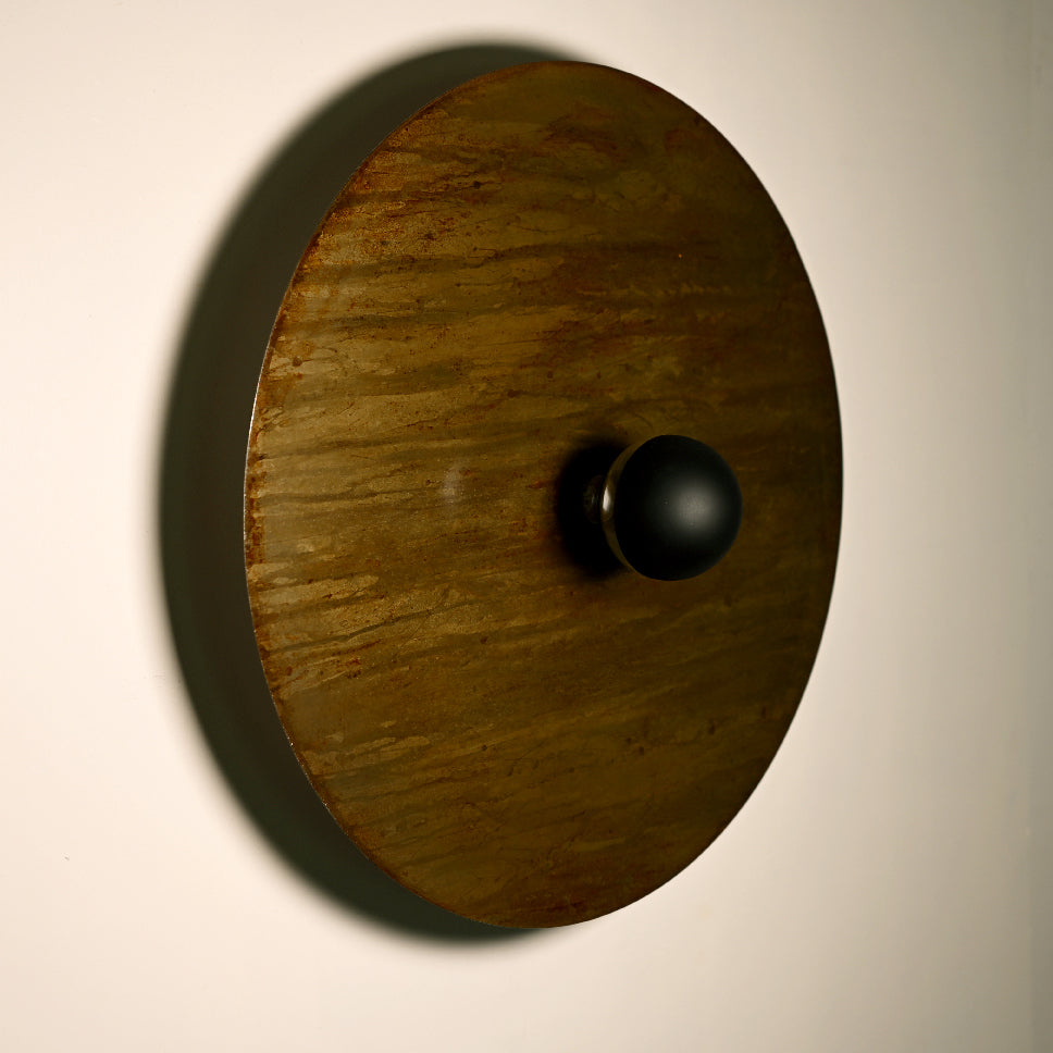 Acier patiné, oxydé et patiné, offrant des teintes très nuancées de brun, de doré patiné des touche de vert de gris.